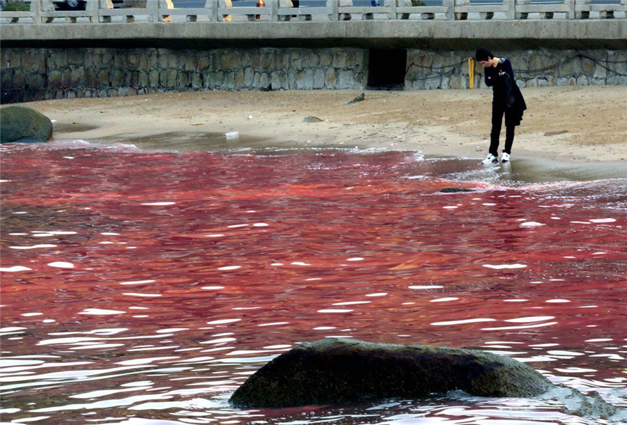 An algal bloom off the city of Zhuhai, south China's Guangdong Province, turns the ocean blood red on Jan. 10, 2015. Harmful algal blooms occur when colonies of algae grow out of control while producing toxic or harmful effects on people, fish, shellfish, marine mammals, and birds. [Photo/youth.cn]