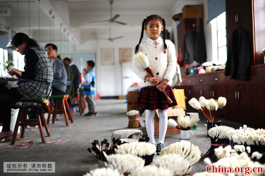 The calligraphy brushes, made at this production base in Shanlian Town, Huzhou City of Zhejiang Province, have been favored by calligraphers throughout China for their excellence in workmanship and variety of styles. [Photo by Wang Chuan/China.com.cn]