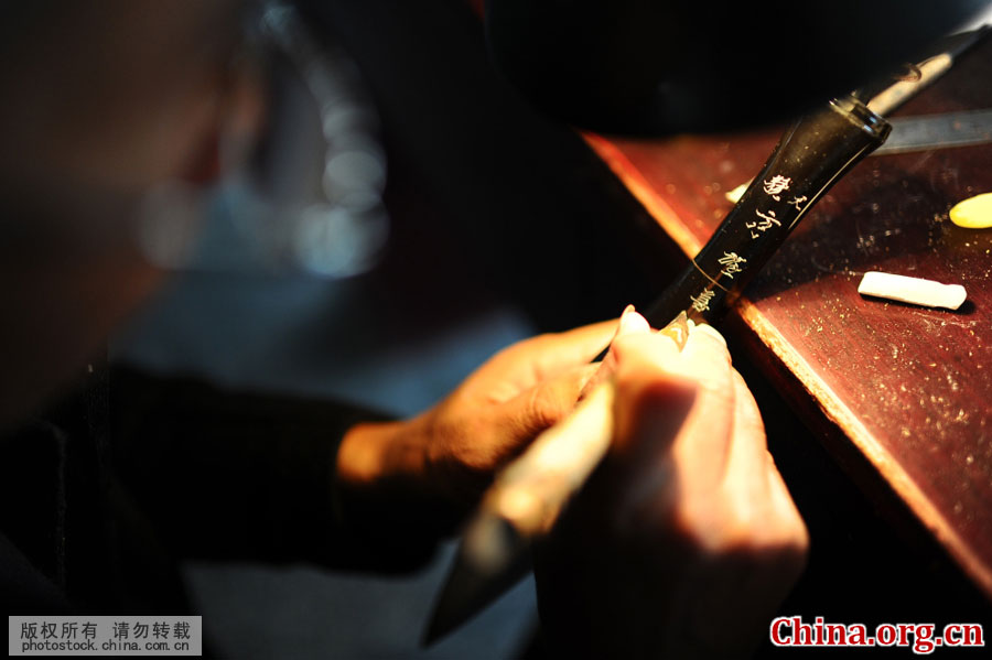 A worker carves characters on the handle of a brush at the Huzhou calligraphy brush production line in Shanlian Town, Huzhou City of Zhejiang Province. The calligraphy brushes produced in the area have been favored by calligraphers throughout China for their excellence in workmanship and variety of styles. [Photo by Wang Chuan/China.com.cn]