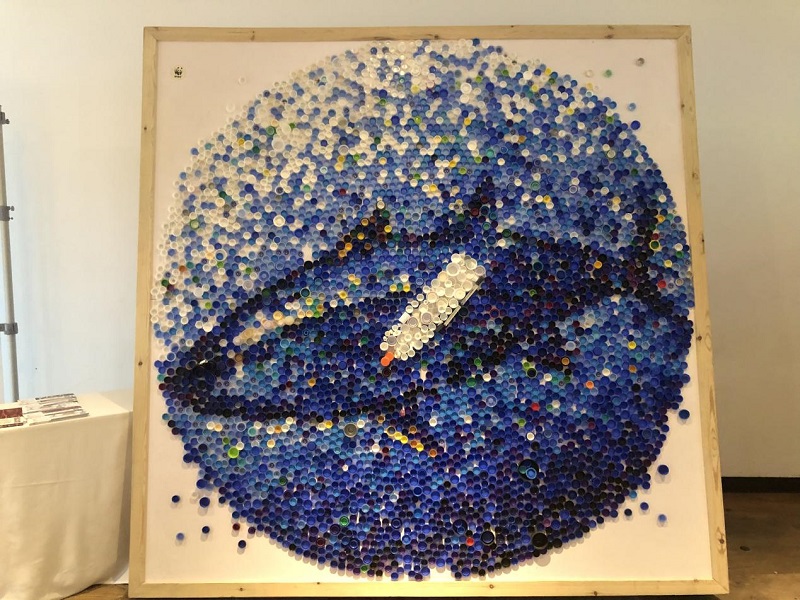 A special picture made of plastic bottle caps to remind people to protect marine ecosystem.