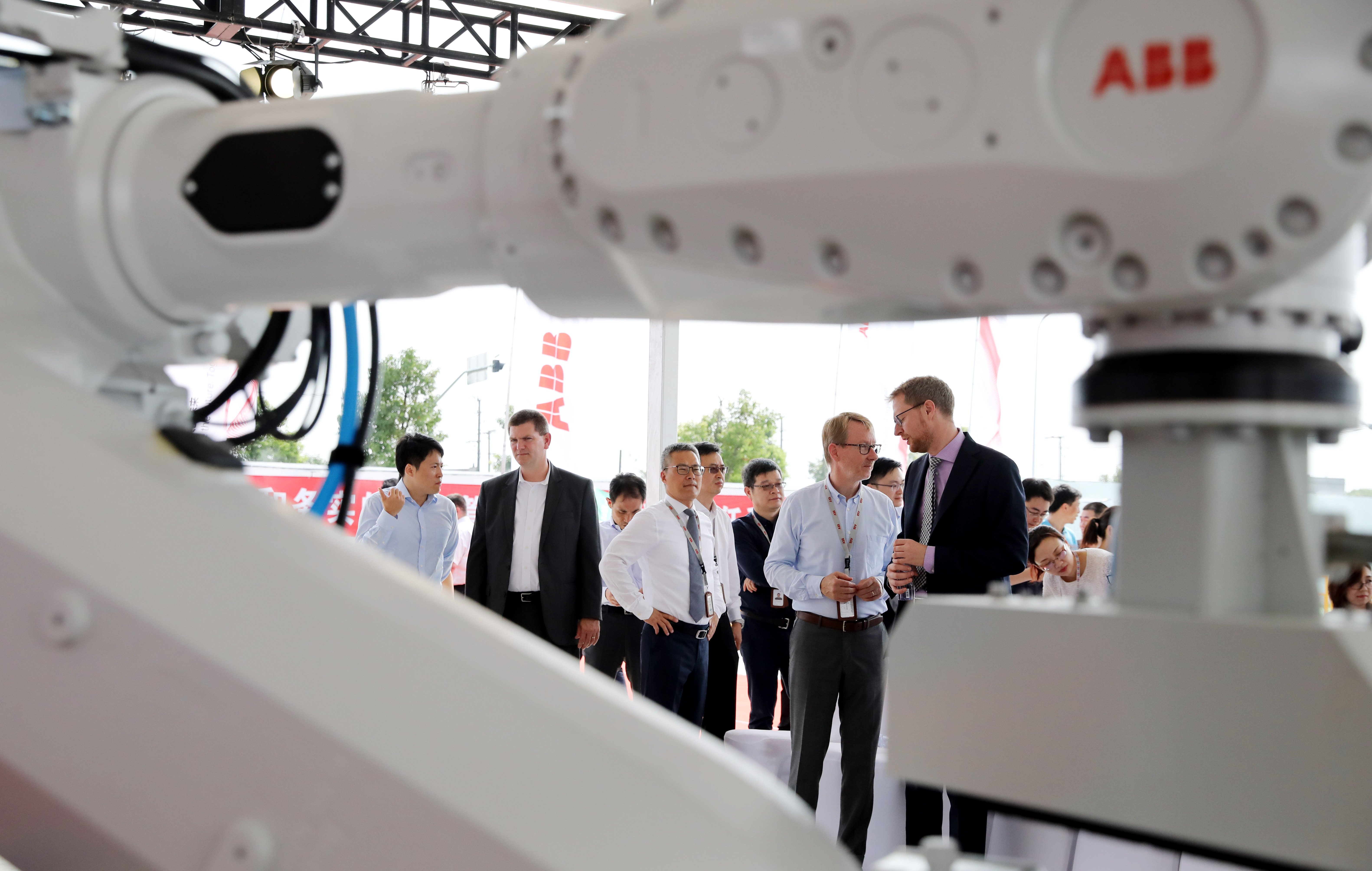 Guests talk with each other during the groundbreaking ceremony of ABB Robotics Factory of the Future in Shanghai, east China, Sept. 12, 2019. [Photo/Xinhua]