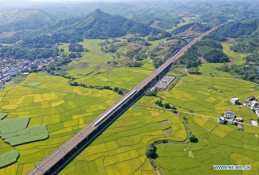 Aerial photo taken on Oct. 29, 2019 shows a bullet train running through the fields of Gula Township of Binyang County, south China's Guangxi Zhuang Autonomous Region. (Xinhua/Lu Boan)