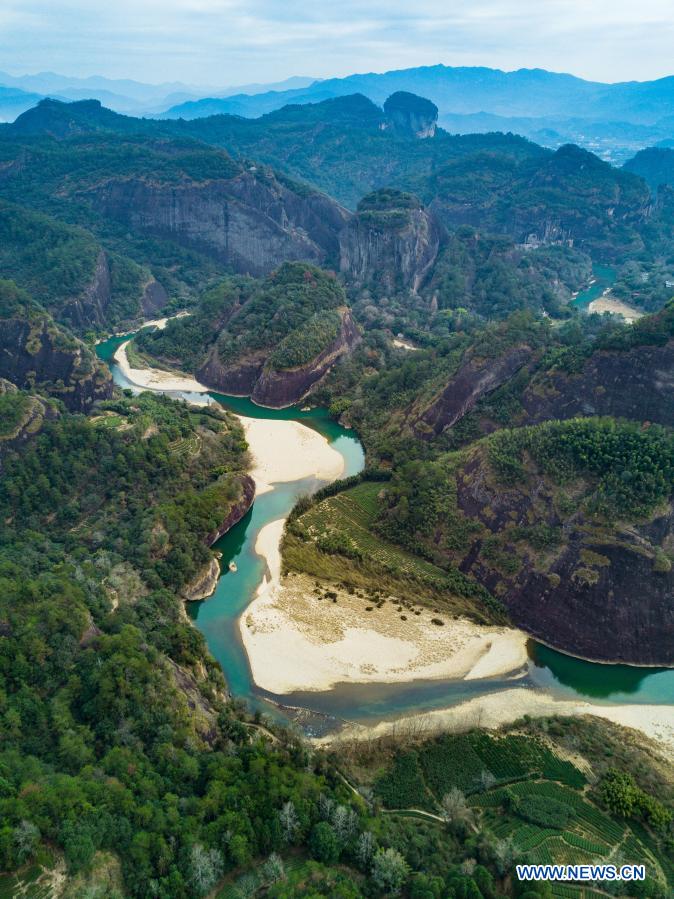 Aerial photo taken on Jan. 3, 2021 shows the scenery of the Jiuqu Stream in Wuyi Mountain, southeast China's Fujian Province. (Xinhua/Song Weiwei)