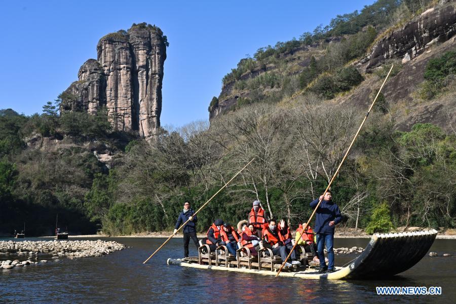 Tourists visit Wuyi Mountain scenic spot on a bamboo raft in southeast China's Fujian Province, Jan. 2, 2021. (Xinhua/Song Weiwei)