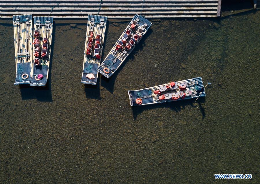 Aerial photo taken on Jan. 2, 2021 shows staff waiting for visitors on bamboo rafts on the Jiuqu Stream in Wuyi Mountain, southeast China's Fujian Province. (Xinhua/Song Weiwei)