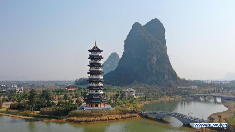 Aerial photo taken on Jan. 4, 2021 shows a view of the Bagongtang wetland park in Liujiang District of Liuzhou, south China's Guangxi Zhuang Autonomous Region. The Bagongtang wetland park has been a popular place for citizens to relax as the ecological rehabilitation project was accomplished recently. Covering over 1,600 mu (about 106.7 hectares), the wetland park is an ecological compound for citizens to go sightseeing and relax. (Photo by Li Hanchi/Xinhua)