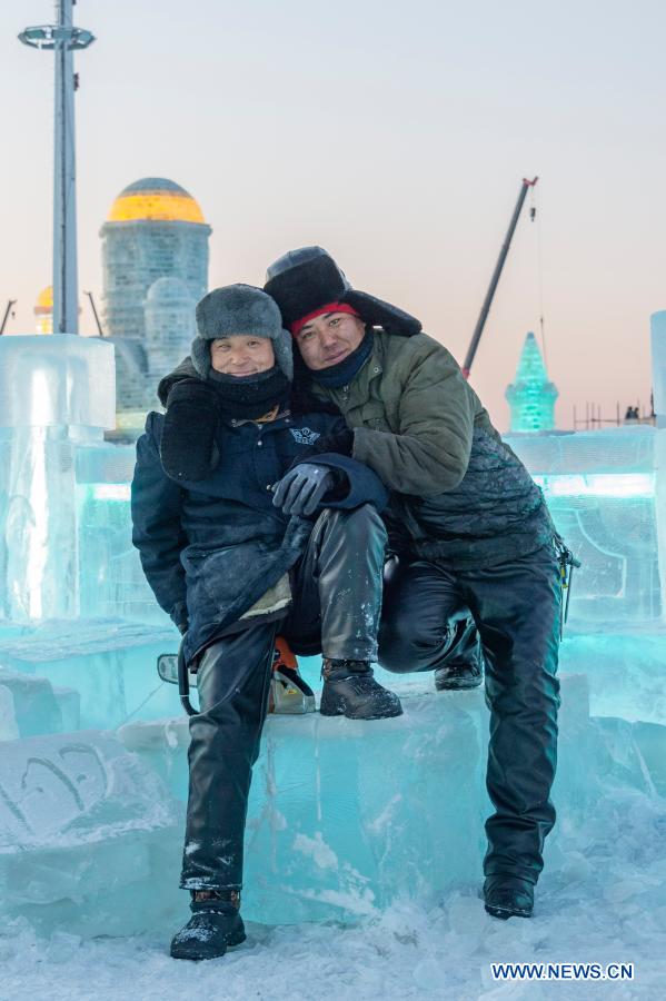 Workers pose for a photo at the Harbin Ice-Snow World, a renowned seasonal theme park opening every winter, in Harbin, northeast China's Heilongjiang Province, Dec. 19, 2020. (Xinhua/Xie Jianfei)