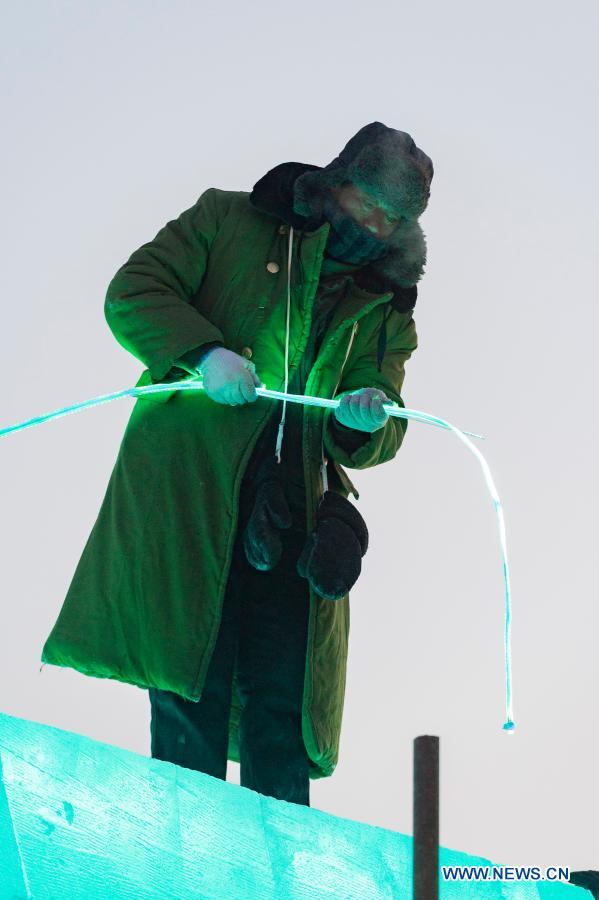 A worker installs light decorations at the Harbin Ice-Snow World, a renowned seasonal theme park opening every winter, in Harbin, northeast China's Heilongjiang Province, Dec. 14, 2020. (Xinhua/Xie Jianfei)