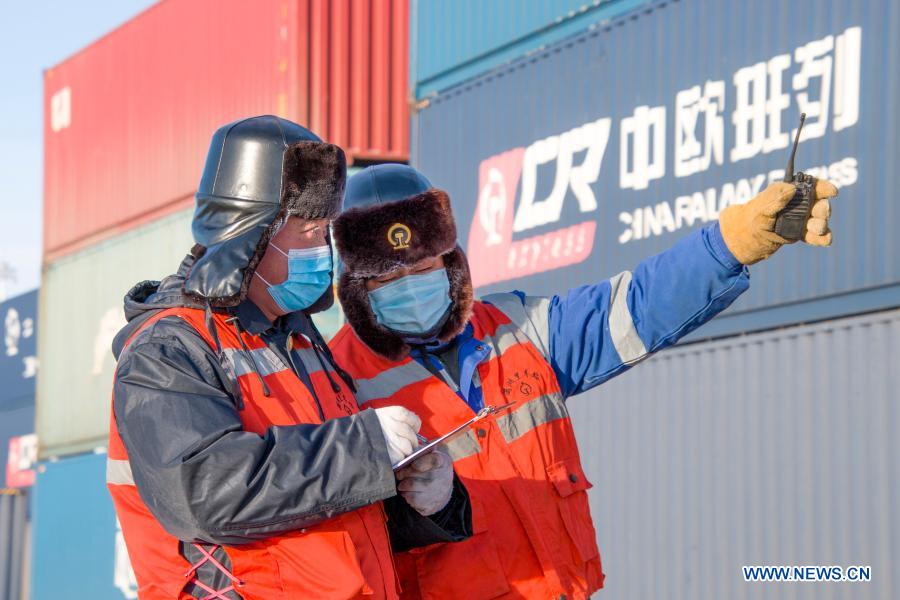 Staff members check information of containers in Manzhouli, north China's Inner Mongolia Autonomous Region, Dec. 30, 2020. The number of China-Europe freight trains arriving and departing via Manzhouli, China's largest land port, reached a record high in 2020 despite the impact of COVID-19, local railway authorities said Wednesday. (Photo by Guo Nailun/Xinhua)