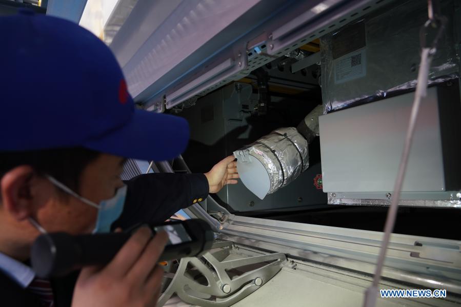 A staff checks the high-speed Electric Multiple Unit (EMU) named Fuxing in China Railway Beijing Group Co., Ltd. in Beijing, capital of China, on Jan. 6, 2021. China on Wednesday debuted a high-speed Electric Multiple Unit (EMU) that can operate under temperatures as low as minus 40 degrees Celsius in Beijing. The EMU, named Fuxing, has a designed speed of 350 km per hour. It is expected to run on the high-speed railway between Beijing and Harbin, capital of China's northernmost province Heilongjiang, according to Zhou Song, with China Railway Beijing Group Co., Ltd. Under extreme cold temperatures, condensed water is prone to form in the power distribution cabinet, affecting the safe operation of trains, according to Xia Sen, with CRRC Qingdao Sifang Co., Ltd, the EMU developer. Designers of the train used a layer of micron-level ceramic porous material on the cabinet. It can store the condensed water in the pores. As the passenger room temperature rises, the condensate evaporates. (Xinhua/Chen Zhonghao)