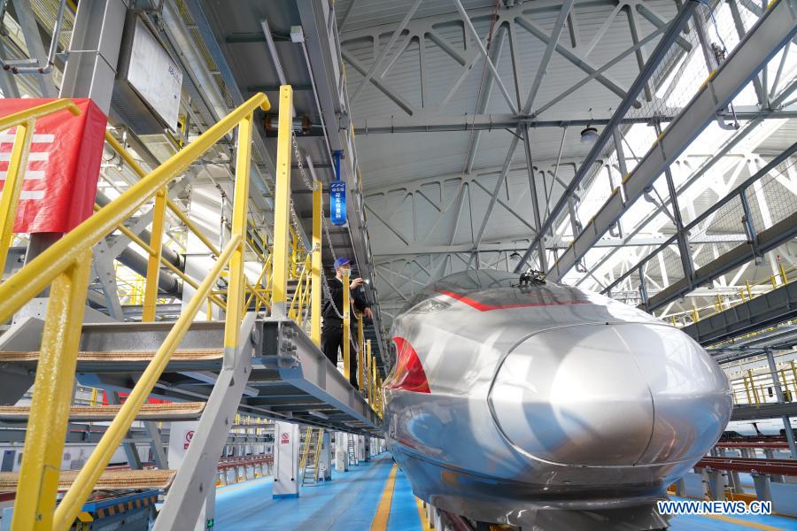 Photo taken on Jan. 6, 2021 shows the high-speed Electric Multiple Unit (EMU) named Fuxing in China Railway Beijing Group Co., Ltd. in Beijing, capital of China. China on Wednesday debuted a high-speed Electric Multiple Unit (EMU) that can operate under temperatures as low as minus 40 degrees Celsius in Beijing. The EMU, named Fuxing, has a designed speed of 350 km per hour. It is expected to run on the high-speed railway between Beijing and Harbin, capital of China's northernmost province Heilongjiang, according to Zhou Song, with China Railway Beijing Group Co., Ltd. Under extreme cold temperatures, condensed water is prone to form in the power distribution cabinet, affecting the safe operation of trains, according to Xia Sen, with CRRC Qingdao Sifang Co., Ltd, the EMU developer. Designers of the train used a layer of micron-level ceramic porous material on the cabinet. It can store the condensed water in the pores. As the passenger room temperature rises, the condensate evaporates. (Xinhua/Chen Zhonghao)
