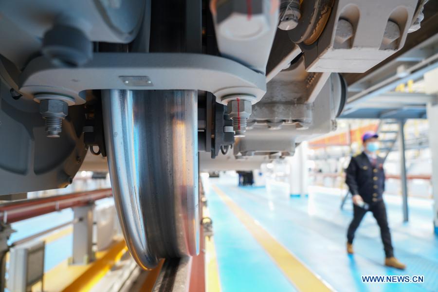 Photo taken on Jan. 6, 2021 shows brake system of the high-speed Electric Multiple Unit (EMU) named Fuxing in China Railway Beijing Group Co., Ltd. in Beijing, capital of China. China on Wednesday debuted a high-speed Electric Multiple Unit (EMU) that can operate under temperatures as low as minus 40 degrees Celsius in Beijing. The EMU, named Fuxing, has a designed speed of 350 km per hour. It is expected to run on the high-speed railway between Beijing and Harbin, capital of China's northernmost province Heilongjiang, according to Zhou Song, with China Railway Beijing Group Co., Ltd. Under extreme cold temperatures, condensed water is prone to form in the power distribution cabinet, affecting the safe operation of trains, according to Xia Sen, with CRRC Qingdao Sifang Co., Ltd, the EMU developer. Designers of the train used a layer of micron-level ceramic porous material on the cabinet. It can store the condensed water in the pores. As the passenger room temperature rises, the condensate evaporates. (Xinhua/Chen Zhonghao)