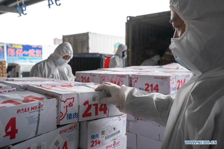 Staff members paste QR codes on imported cold chain food for traceable management at a regional cold chain center in Wuhan, capital of central China's Hubei Province, Jan. 7, 2021. (Xinhua/Xiong Qi)