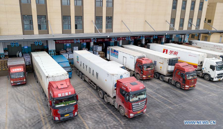 Aerial photo taken on Jan. 7, 2021 shows imported cold chain food discharged at a regional cold chain center in Wuhan, capital of central China's Hubei Province. (Xinhua/Xiong Qi)