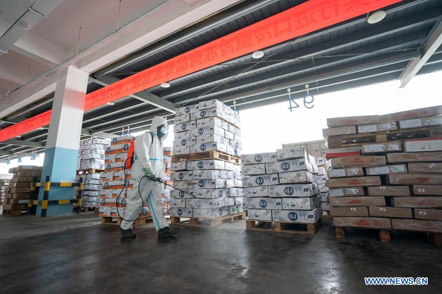 A staff member sprays disinfectant at a regional cold chain center in Wuhan, capital of central China's Hubei Province, Jan. 7, 2021. (Xinhua/Xiong Qi)