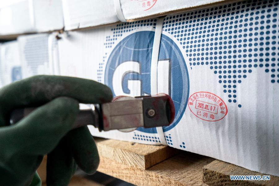 A staff member seals imported cold chain food after disinfection at a regional cold chain center in Wuhan, capital of central China's Hubei Province, Jan. 7, 2021. (Xinhua/Xiong Qi)
