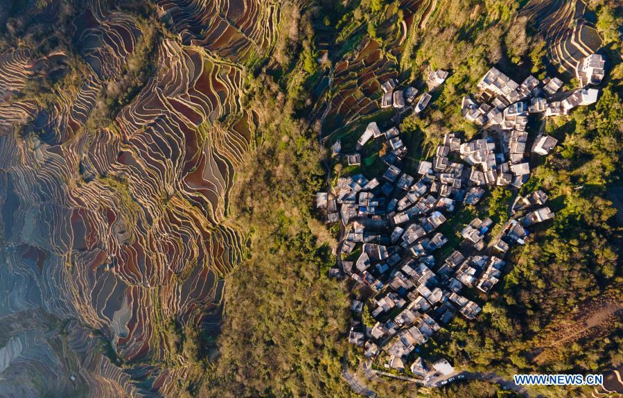 Aerial photo taken on Jan. 6, 2021 shows Hani terraced fields in Yuanyang County, southwest China's Yunnan Province. (Xinhua/Wang Guansen)