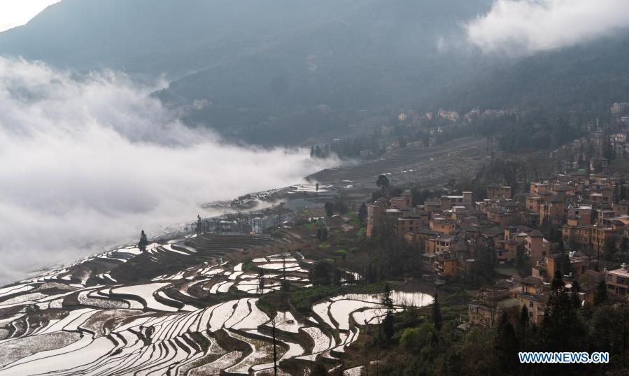 Photo taken on Jan. 6, 2021 shows Hani terraced fields in Yuanyang County, southwest China's Yunnan Province. (Xinhua/Wang Guansen)
