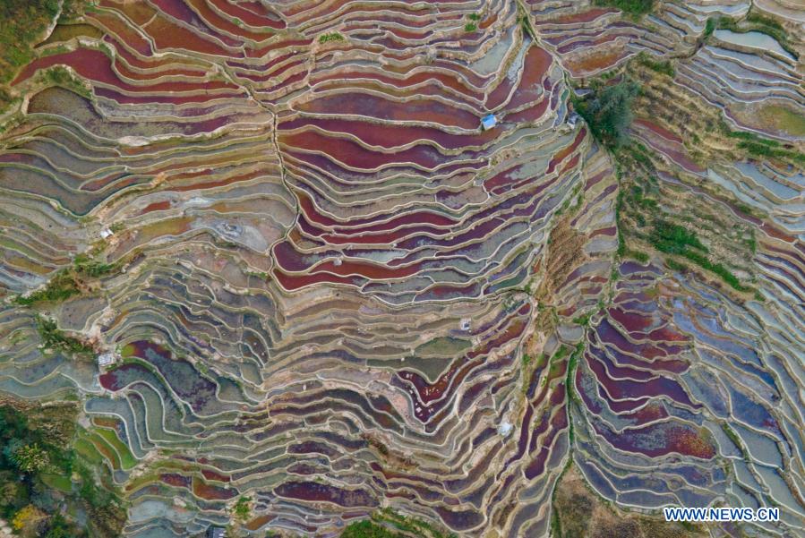 Aerial photo taken on Jan. 6, 2021 shows Hani terraced fields in Yuanyang County, southwest China's Yunnan Province. (Xinhua/Wang Guansen)