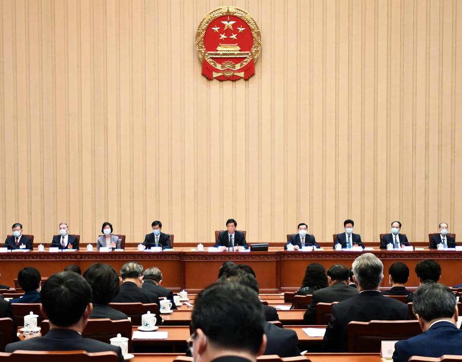Li Zhanshu, chairman of the National People's Congress (NPC) Standing Committee, presides over the first meeting of the presidium for the fourth session of the 13th NPC at the Great Hall of the People in Beijing, capital of China, March 4, 2021. (Xinhua/Xie Huanchi)
