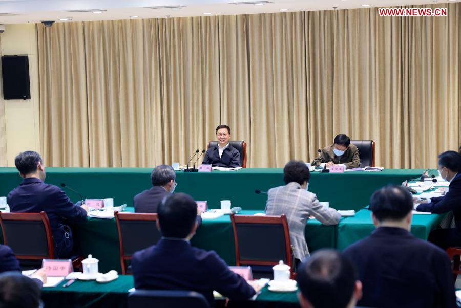 Chinese Vice Premier Han Zheng, also a member of the Standing Committee of the Political Bureau of the Communist Party of China Central Committee, attends a fiscal and tax work conference at the Chinese Academy of Fiscal Sciences in Beijing, capital of China, March 23, 2021. (Xinhua/Ding Haitao)