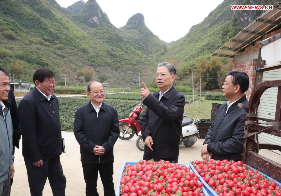 Zhao Leji, a member of the Standing Committee of the Political Bureau of the Communist Party of China (CPC) Central Committee and secretary of the CPC Central Commission for Discipline Inspection, visits Lumei Village in Tianyang District of Baise City, south China's Guangxi Zhuang Autonomous Region, March 21, 2021. Zhao made an inspection tour in south China's Guangxi Zhuang Autonomous Region from March 21 to 24. (Xinhua/Ding Lin)