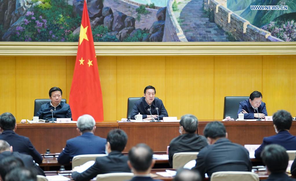 Chinese State Councilor Wang Yong, deputy head of the State Council leading group for the state-owned enterprises (SOEs) reform, attends a teleconference on freeing up SOEs from performing social functions and solving the issues left over by history in Beijing, capital of China, April 1, 2021. (Xinhua/Yin Bogu)