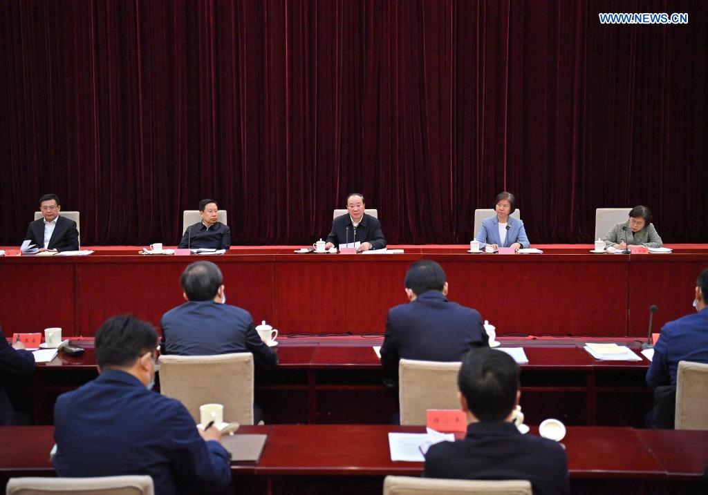 Huang Kunming, a member of the Political Bureau of the Communist Party of China (CPC) Central Committee, head of the Publicity Department of the CPC Central Committee, and also a deputy director of the Central Commission for Guiding Cultural and Ethical Progress, speaks at a symposium on family, family education and family virtues in Beijing, capital of China, April 8, 2021. Shen Yueyue, vice chairperson of the Standing Committee of the National People's Congress of China and president of the All-China Women's Federation, presided over the meeting. (Xinhua/Yue Yuewei)