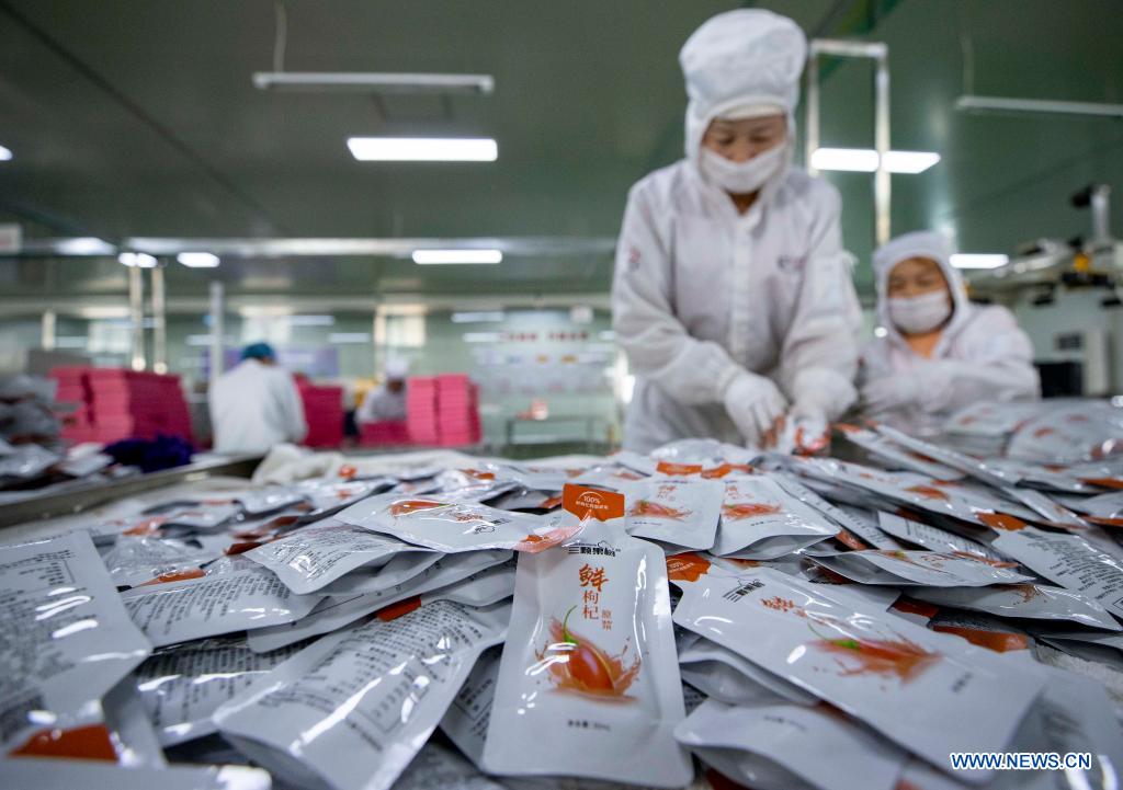 Workers pack goji berry products at a goji berry processing company in Zhongning County, northwest China's Ningxia Hui Autonomous Region, July 2, 2021. (Xinhua/Yang Zhisen)