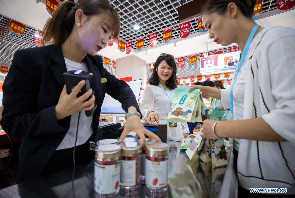 Customers buy goji berry products at a specialty supermarket in Zhongning County, northwest China's Ningxia Hui Autonomous Region, July 2, 2021. (Xinhua/Yang Zhisen)