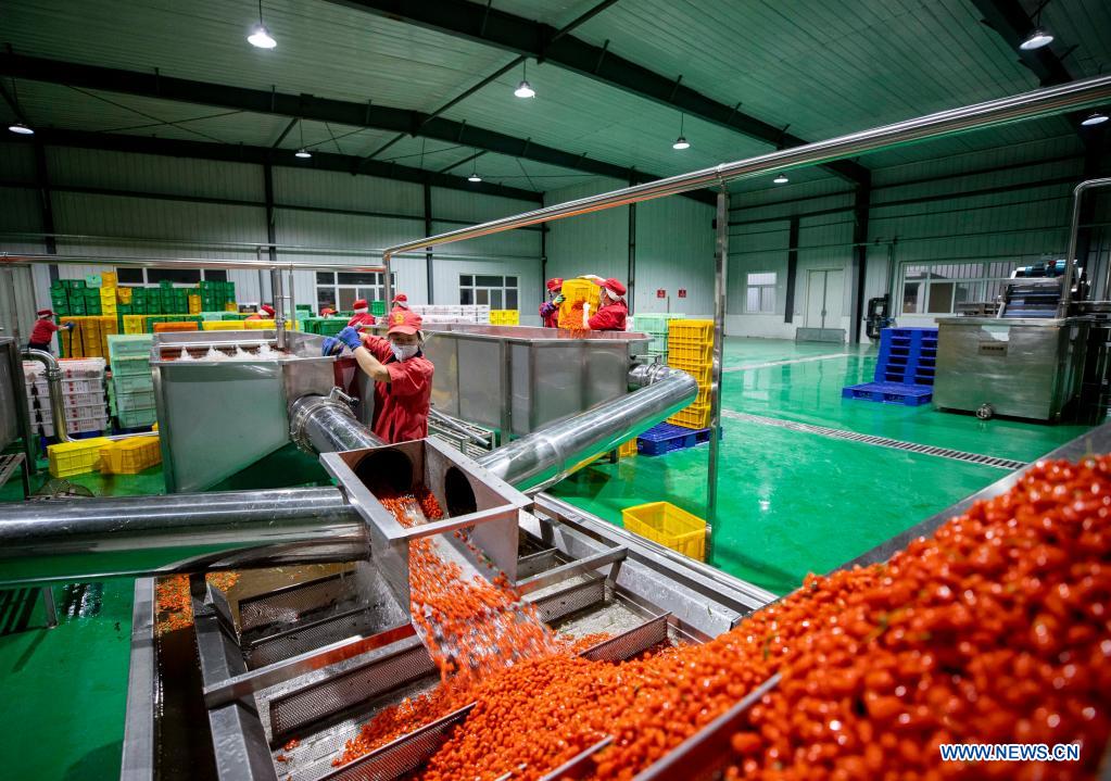 Workers clean fresh goji berries at a goji berry processing company in Zhongning County, northwest China's Ningxia Hui Autonomous Region, July 1, 2021. (Xinhua/Yang Zhisen)