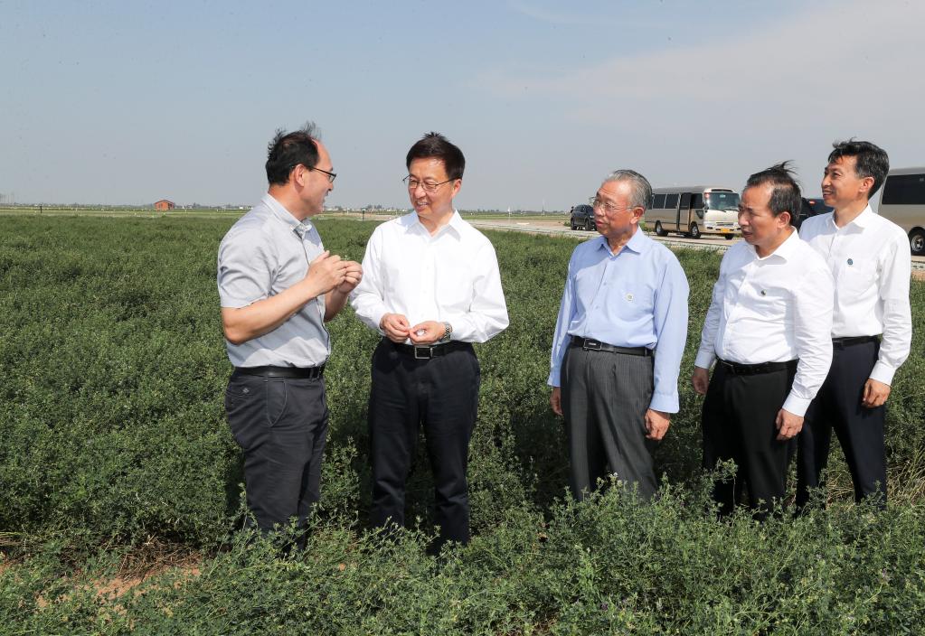Chinese Vice Premier Han Zheng, also a member of the Standing Committee of the Political Bureau of the Communist Party of China Central Committee, inspects a modern agriculture technological innovation center of the Yellow River Delta in east China's Shandong Province, July 5, 2021. Han made an inspection tour to east China's Shandong Province from Monday to Tuesday. (Xinhua/Yao Dawei)