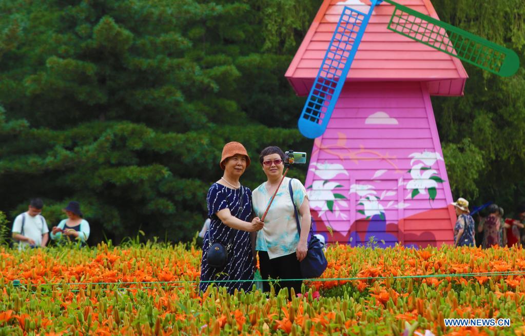 People take selfies beside lilies at Shenshuiwan Park in Shenyang, northeast China's Liaoning Province, July 6, 2021. (Xinhua/Yang Qing)