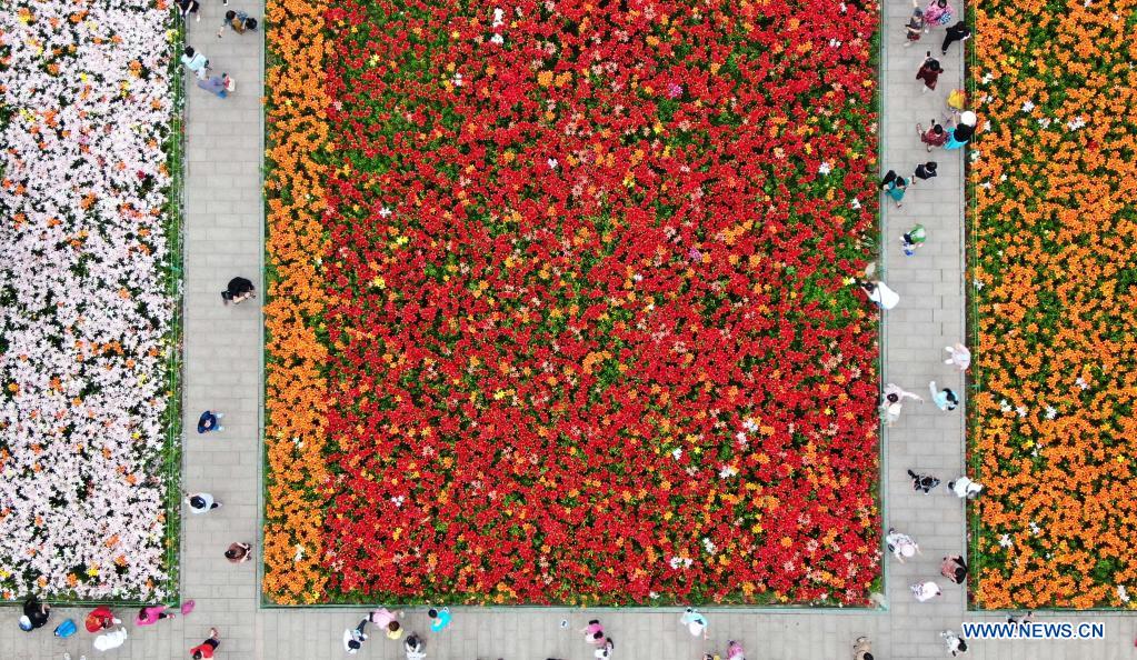 Aerial photo shows people enjoying themselves beside lilies at Shenshuiwan Park in Shenyang, northeast China's Liaoning Province, July 6, 2021. (Xinhua/Yang Qing)