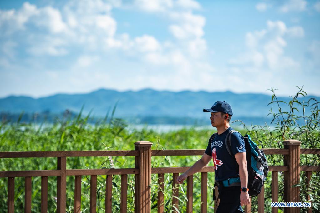 A tourist walks at the Caohai National Nature Reserve in the Yi, Hui and Miao Autonomous County of Weining, southwest China's Guizhou Province, July 7, 2021. (Xinhua/Tao Liang)