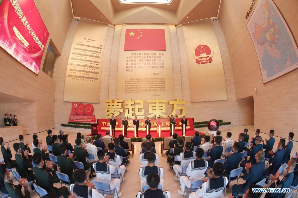 Photo taken on July 8, 2021 shows the opening ceremony of the exhibition center of the Chinese People's Liberation Army (PLA) Garrison in the Hong Kong Special Administrative Region (HKSAR) at the Ngong Shuen Chau Barracks in Hong Kong, south China. (Photo by Yi Ding/Xinhua)