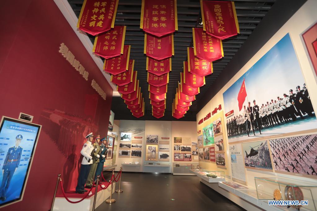 Photo taken on June 28, 2021 shows the hall under the theme about guardians of Hong Kong at the exhibition center of the Chinese People's Liberation Army (PLA) Garrison in the Hong Kong Special Administrative Region (HKSAR) in Hong Kong, south China. (Photo by Meng Chuiyun/Xinhua)