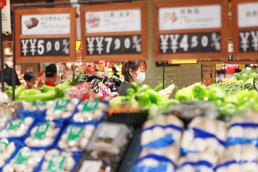 A staff member arranges products at a supermarket in Handan City, north China's Hebei Province, June 9, 2021. [Photo/Xinhua]