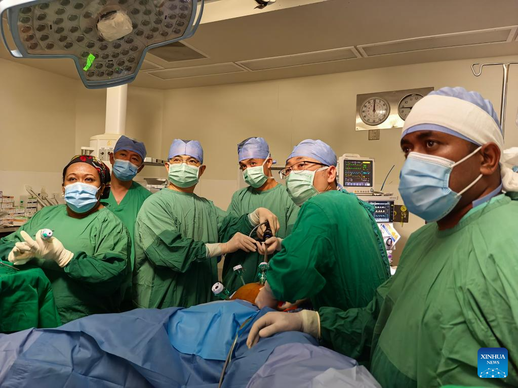 Chinese doctors from the Chinese Navy hospital ship "Silk Road Ark" and local doctors perform a surgery on a patient at a local hospital in Suva, Fiji, Oct. 6, 2025. The Chinese Navy hospital ship "Silk Road Ark," which is on "Mission Harmony-2025," successfully completed a seven-day friendly visit and humanitarian medical service to Fiji and set off for Tonga on Wednesday. (Photo by Cui Xiaoyang/Xinhua)