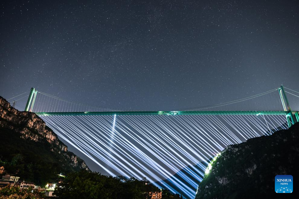 This photo taken on Oct. 11, 2025 shows the Huajiang Grand Canyon Bridge under the starry sky in southwest China's Guizhou Province. The Huajiang Grand Canyon Bridge, soaring 625 meters above the Beipan River in Guizhou's mountainous terrain, is the world's tallest bridge.