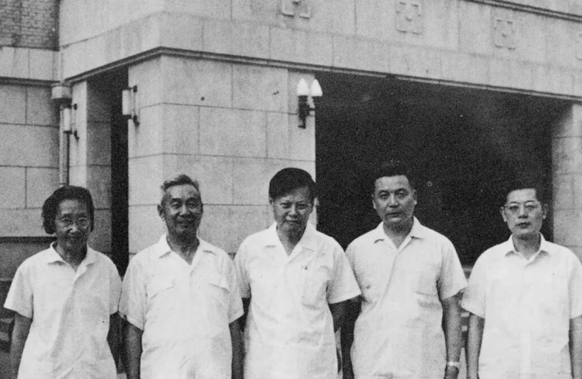 A photo taken in 1972 shows Yang Chen-Ning (center), Wang Chengshu (left 1), Zhang Wenyu (left 2), Deng Jiaxian (right 2) and Zhou Guangzhao in Beijing.