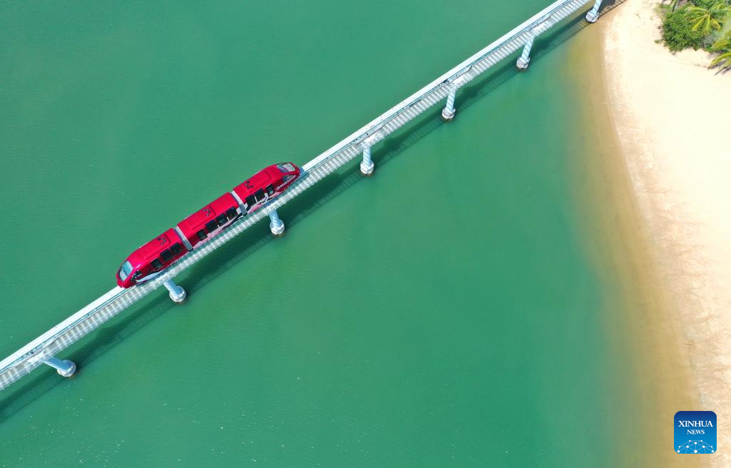 An aerial photo shows a mini train running at Hainan Ocean Paradise Resort in Lingshui Li Autonomous County in south China's Hainan Province, Oct. 19, 2025. Many tourists choose to travel off-peak to China's island province of Hainan, a popular tourist destination, as prices of transport and accommodation dip following China's National Day holiday. (Xinhua/Guo Cheng)