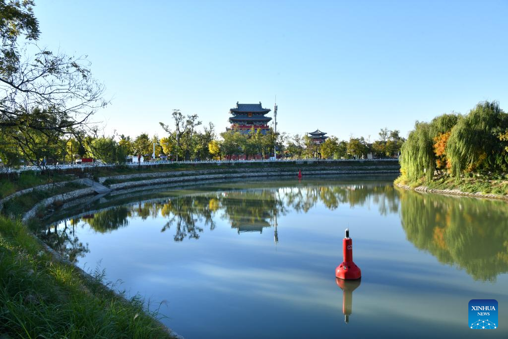 This photo taken on Oct. 30, 2025 shows the scenery of the Grand Canal and an embankment road in Yunhe District of Cangzhou, north China's Hebei Province.