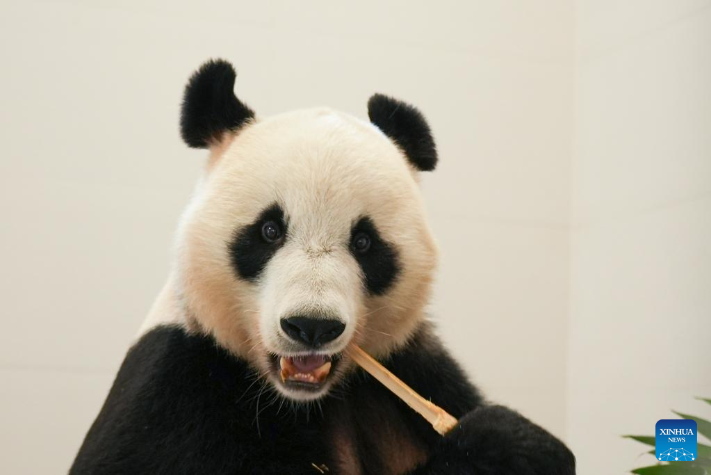 A giant panda eats bamboo after moving into an enclosure at the Mianyang base of China Conservation and Research Center for the Giant Panda in Mianyang City, southwest China's Sichuan Province, on Nov. 4, 2025. The Mianyang base of China Conservation and Research Center for the Giant Panda, which took three years to build, was put into trial operation on Tuesday. Thirteen pandas from Wolong Shenshuping and Dujiangyan bases of China Conservation and Research Center for the Giant Panda moved into their new home at the newly opened Mianyang base on the day.