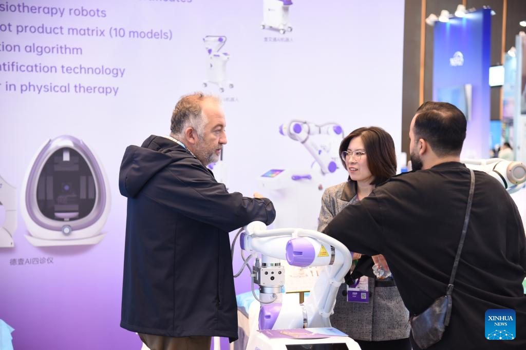 Buyers learn about an intelligent medical equipment during the 138th edition of the China Import and Export Fair in Guangzhou, south China's Guangdong Province, Nov. 4, 2025. The 138th Canton Fair, known officially as the China Import and Export Fair, came to a close on Tuesday in Guangzhou, the capital city of south China's Guangdong Province, having seen a record number of overseas buyers attend. (Xinhua/Hong Zehua)