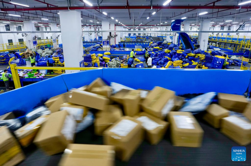 Staff members sort parcels at a management center of ZTO Express in Helan County, Yinchuan, northwest China's Ningxia Hui Autonomous Region, Nov. 11, 2025.