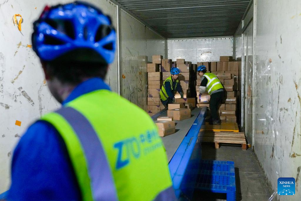 Staff members unload parcels at a management center of ZTO Express in Helan County, Yinchuan, northwest China's Ningxia Hui Autonomous Region, Nov. 11, 2025.
