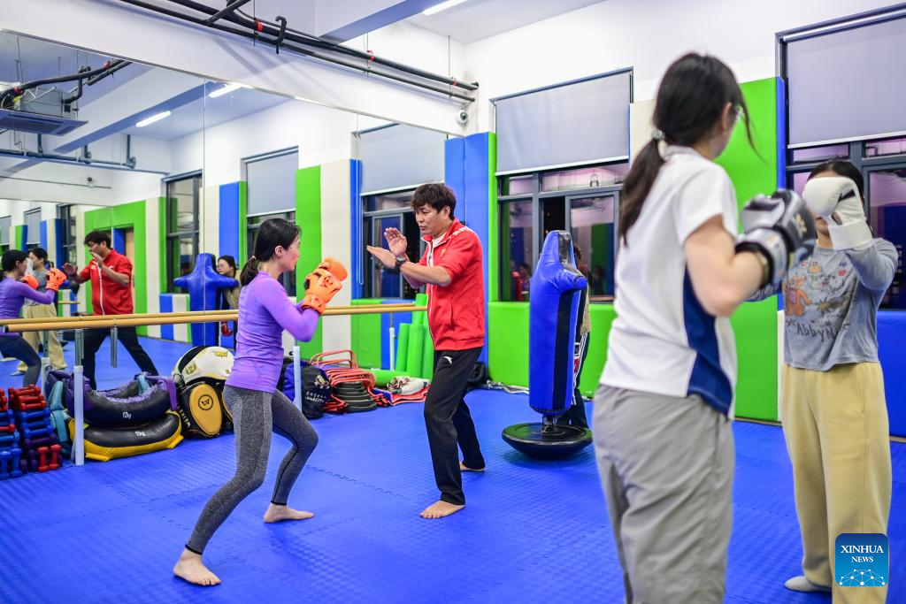 A teacher (2nd L) instructs a citizen during a night-time boxing class held at the youth activity center in Jiangbei District of Ningbo, east China's Zhejiang Province, Nov. 26, 2025. Starting from 2024, Jiangbei District in Ningbo has integrated educational and training resources from universities, hospitals, law firms and other enterprises and institutions in a night-time school project, offering courses in foreign languages, dance, music and fashion design, among others. It has enrolled more than 9,600 citizens by now. (Xinhua/Jiang Han)