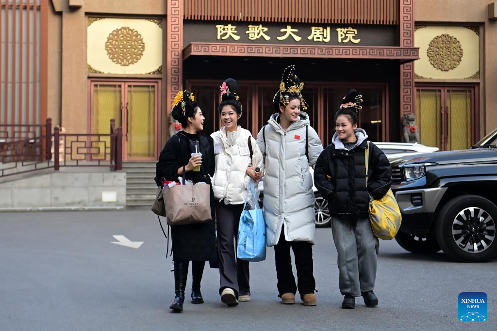 Actresses walk to their livestream studio in Xi'an, northwest China's Shaanxi Province, Jan. 15, 2026. At the Shaanxi Provincial Song and Dance Troupe, "group livestreaming" -- a new format featuring multi-performer live broadcasts -- is becoming a fresh approach for professional art troupes to explore an online "second stage" and promote the innovative expression of traditional culture.