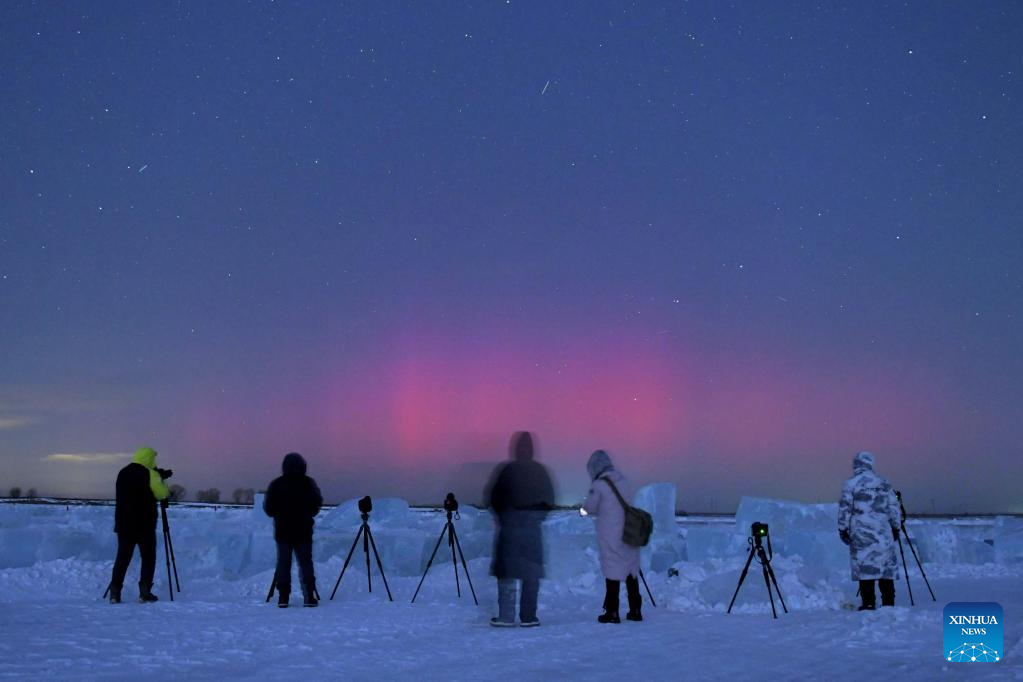 People take photos of the aurora observed from Qiqihar, northeast China's Heilongjiang Province, Jan. 20, 2026. (Photo by Wang Yonggang/Xinhua)